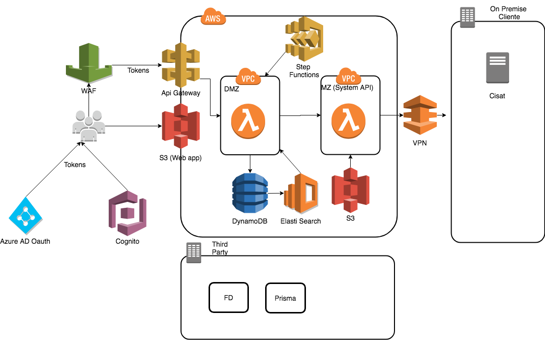 The integration with On Premise is done through the connection: Direct Connect that the bank has with AWS and connecting to the services exposed by IBM Message Broker.